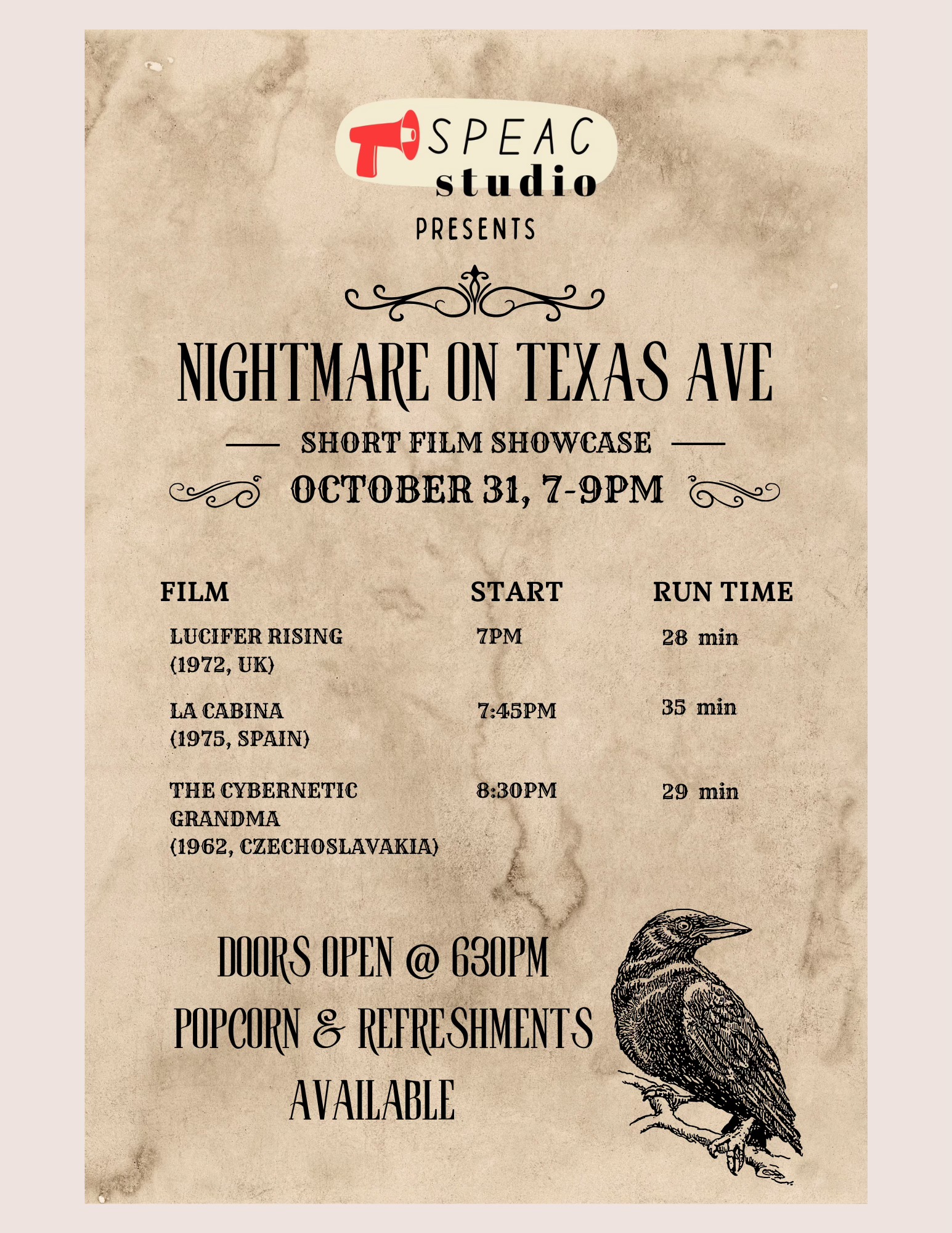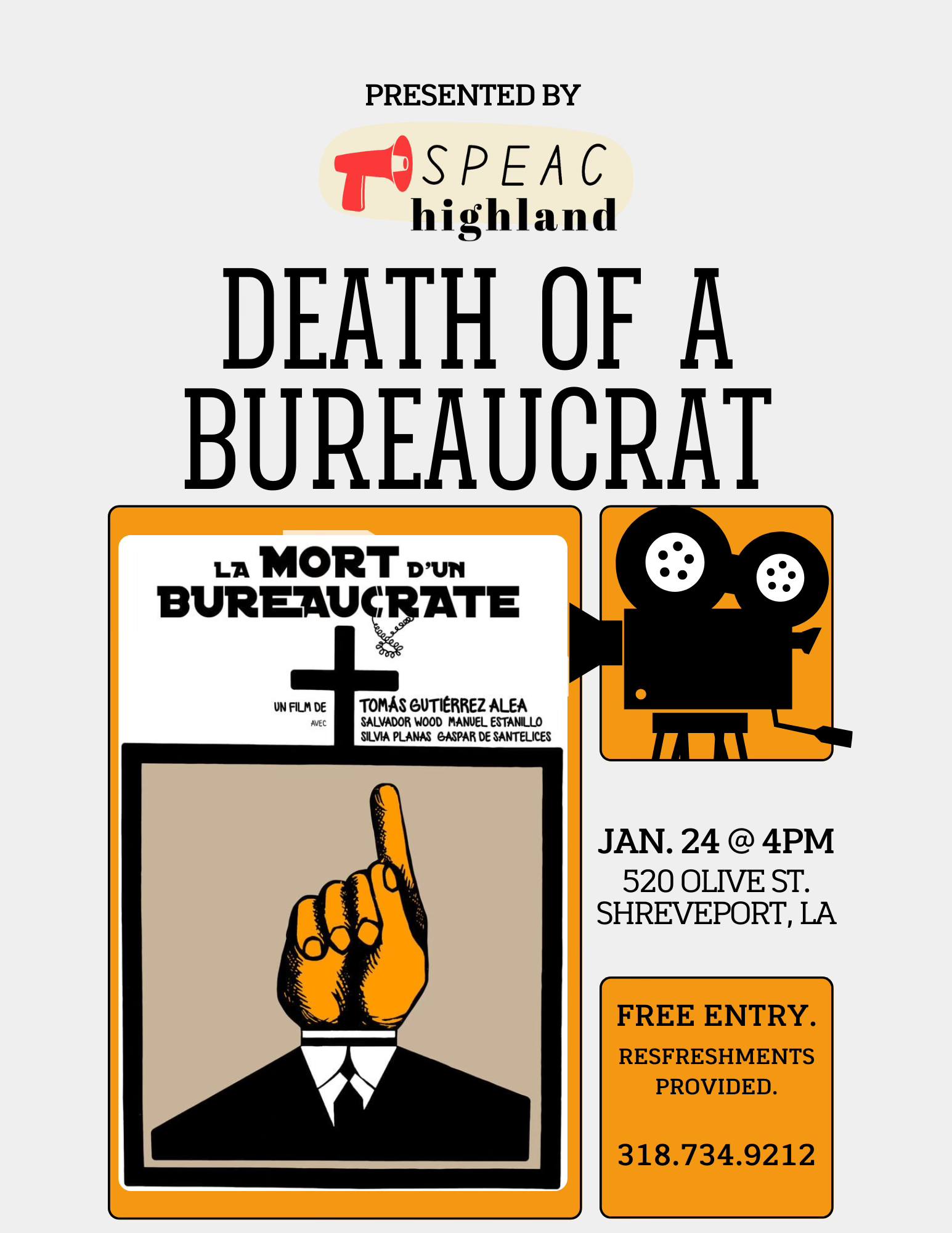 Death of a Bureaucrat (1966); the struggle of a recently bereaved artist against the revolutionary bureaucracy to bury his uncle who died in a tragic statue-making accident. A satire of the short-comings of the Cuban revolution, and a revolutionary critique of bureaucracy everywhere. At the Highland Center, 810 Olive Street, Shreveport, Louisiana. Doors open @ 4pm.